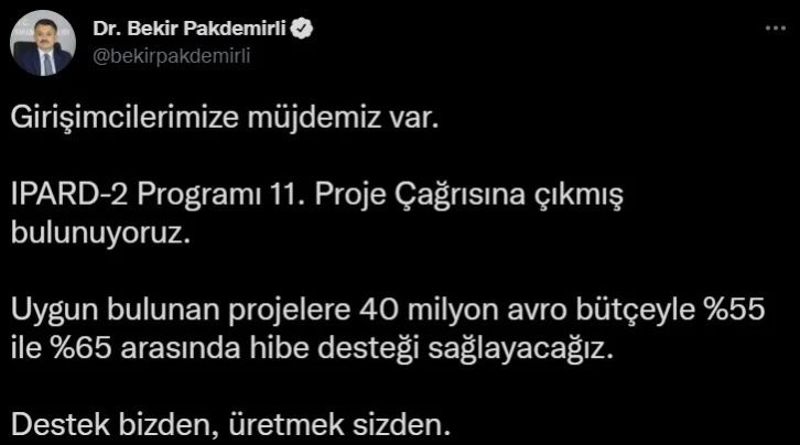 Tarım ve Orman Bakanı Bekir Pakdemirli, sosyal medya hesabından yaptığı paylaşımda, “Girişimcilerimize müjdemiz var. IPARD-2 Programı 11. Proje Çağrısı’na çıkmış bulunuyoruz. Uygun bulunan projelere 40 milyon euro bütçeyle yüzde 55 ile yüzde 65 arasında hibe desteği sağlayacağız. Destek bizden, üretmek sizden” ifadelerini kullandı.