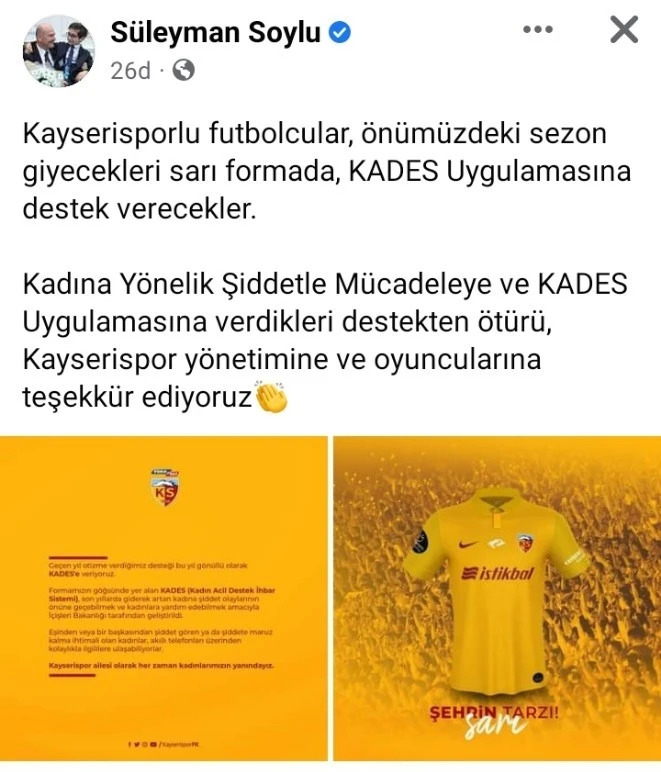 İçişleri Bakanı Süleyman Soylu, formasında Kadın Destek Uygulaması’na (KADES) yer veren Kayserispor yönetimine teşekkür etti.