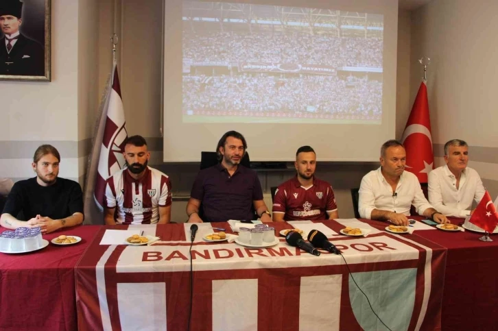 Bandırmaspor Kulüp Başkanı Onur Göçmez ve yönetim kurulu üyelerinin de hazır bulunduğu imza töreninde 3 oyuncu sözleşmelere imza attı. Yunanistan’ın Aris takımında oynayan Yunan forvet oyuncusu Dimitrios Manos geçtiğimiz günlerde takıma kazandıran bordo-beyazlı ekip, Macaristan ekiplerinden Ujpest takımında oynayan Yunanlı defans oyuncusu Georgios Koutroumpis ile de 2 yıllık anlaşma sağladı. Bordo-beyazlılar ayrıca Adana Demirsporlu forvet oyuncusu Sedat Şahin’i de bir yıllığına kiraladı. Törende konuşan Bandırmaspor Kulübü Başkanı Onur Göçmez, “Yeni bir sezon, finansal anlamda zor bir sezonun başındayız. Bence Türkiye’nin ligi artık TFF 1. Çünkü Süper Lig bu kadar yayılmamıştı. Gelen takımların yapmış olduğu transferler, bizler gibi mevcut takımı koruyanların yarışacağı ve alttan da sürprizlerin olacağı güzel bir lig olacak. Soruyorlar bana hedef nedir, şampiyonluk nedir gibisinden. Bizim için tek hedef var, en keyifli ve en güzel futbolu oynamaktır. Bunun içinde yapmış olduğumuz 6 aylık çalışma sonrasında eksikliklerimizi belirleyip transferlerimiz ona göre yapıyoruz. Hedeflerimizden ilki en kısa sürede kampa götürmekti. Şu anda onu gerçekleştiriyoruz. Pazartesi günü Bandırma’da başlıyoruz ve çarşamba günü de Bolu’da kamp yapacağız” dedi. "Halil Umut Meler ve Mete Kalkavan’ı asla maçlarımızda görmek istemiyoruz"
