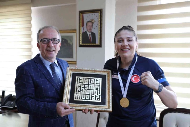 Bartın Üniversitesi (BARÜ) mezunu Şennur Demir, Dünya Kadınlar Boks Şampiyonasında elde ettiği tarihi başarının ardından Rektör Prof. Dr. Orhan Uzun’u ziyaret etti.