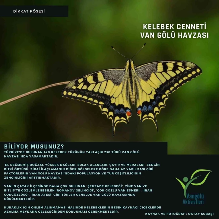 Her hafta Van’da bir dikkat köşesi oluşturan Van Gölü Aktivistleri Derneğinin bu haftaki dikkat köşesi, Van Gölü Havzası’nda yaşayan kelebek türleri oldu. Bölgede yaşayan 230 tür kelebeğin koruma altına alınması gerektiğini ifade eden Dernek Başkanı Özel, “Türkiye’de bulunan 420 kelebek türünün yaklaşık 230 türü Van Gölü Havzası’nda yaşamaktadır. El değmemiş doğası, yüksek dağları, sulak alanları, çayır ve meraları, zengin bitki örtüsü, zirai ilaçlamanın diğer bölgelere göre daha az yapılması gibi faktörlerin Van Gölü Havzası’ndaki popülasyon ve tür çeşitliliğinin zenginliğini arttırmaktadır. Van’ın Çatak ilçesinde daha çok bulunan ’Şehzade Kelebeği’, yine Van ve Bitlis’te gözlemlenebilen ’Romanov Gelinciği’, ’Çok Gözlü Van Esmeri’, ’İran Çok gözlüsü’, ’İran Ateşi’ gibi türler genelde Van Gölü Havzası’nda görülmektedir. Kuraklık için önlem alınmaması halinde kelebeklerin besin kaynağı çiçeklerde azalma meydana geleceğinden korunması gerekmektedir. Dikkat köşemizde bu hafta, kelebek cenneti Van Gölü Havzası bulunuyor. Doğal güzelliğinin muhteşem olduğu bu canlıların korunması ve neslinin güvenceye alınması gerekmektedir. Fotoğraf ve bilgilerinden dolayı Oktay Subaşı’na teşekkür ederiz” dedi.