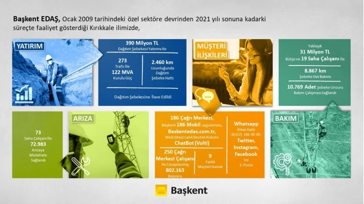 Hizmet verdiği tüm illerde kaliteli ve kesintisiz enerji hedefiyle faaliyetlerini sürdüren Başkent EDAŞ, Kırıkkale’deki çalışmalarına elektrik dağıtım faaliyetlerinin özel sektöre devredildiği 2009 yılından bu yana aralıksız devam ediyor. Başkent EDAŞ elektrik dağıtım faaliyetlerinin özel sektöre devredildiği 2009’dan 2021 yılı sonuna kadar Kırıkkale özelinde 390 milyon lira tutarında yatırım gerçekleştirdi. Elektriğin modern hayatın her aşamasında taşıdığı önemin bilinciyle çalışmalarını sürdüren şirket, mevzuata tam uyumla yerine getirdiği faaliyetleri çerçevesinde yeni yatırımları devreye aldı, ayrıca şebeke ve ekipmanların bakımlarını da tamamladı. Şirketin çalışmaları ve yatırımları hakkında şu bilgiler verildi: