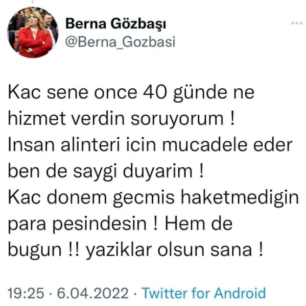 Başkan Gözbaşı, yaptığı ikinci paylaşımında ise, "Kaç sene önce 40 günde ne hizmet verdin, soruyorum. İnsan alın teri için mücadele eder, ben de saygı duyarım. Kaç dönem geçmiş. Hak etmediğin para peşindesin. Hem de bugün. Yazıklar olsun sana" diyerek tepkisini dile getirdi. Kayserispor Başkanı Berna Gözbaşı’nın paylaşımına takipçilerinden destek geldi.