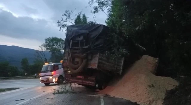 Bursa’da kum yüklü kamyonun kontrolden çıkarak devrildiği kazada sürücü hafif şekilde yaralandı.