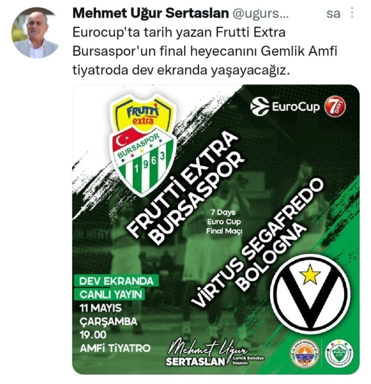Gemlik Belediye Başkanı Mehmet Uğur Sertaslan, "Eurocup’ta tarih yazan Frutti Extra Bursaspor’un final heyecanını Gemlik amfi tiyatroda dev ekranda yaşayacağız" diyerek, tüm Gemliklileri dev ekranda maç keyfine davet etti.