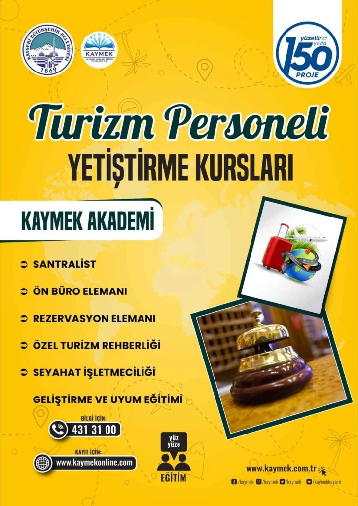 Büyükşehir Belediyesi Kayseri Mesleki Eğitim ve Kültür A.Ş. (KAYMEK), büyük bir turizm potansiyeline sahip olan Kayseri’de sektörün nitelikli eleman ihtiyacını karşılamak amacıyla “150 Yılda 150 Proje” çerçevesinde “Turizm Personeli Yetiştirme Kursları” düzenliyor. Turizm Personeli Yetiştirme Kursları 4 Temmuz Pazartesi günü başlayacak.