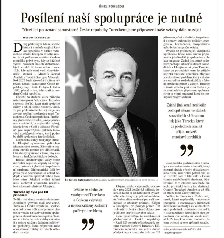 Çekya’nın ünlü gazetesi Lidove Noviny, resmi ziyaret için ülkede bulunan Dışişleri Bakanı Mevlüt Çavuşoğlu’nun “Türkiye’nin Çekya’yı tanımasının 30. yıldönümünde Türk-Çek ilişkilerine genel bakış” başlıklı makalesini yayınladı. Makalesinde zengin tarihi ve kültürü ile Çekya’nın, Türkiye’nin Orta Avrupa ile bağlarında özel bir yere sahip olduğunu belirten Çavuşoğlu, iki vizyoner devlet adamı Mustafa Kemal Atatürk ve Tomas Garrigue Masaryk önderliğinde 1924’de kurulan diplomatik ilişkilerin yüzüncü yılına yaklaştığı dönemde gerçekleştirdiği ziyaretin önemine dikkat çekti. Çavuşoğlu, Türkiye’nin 2023’te Çek Cumhuriyeti’ni tanımasının 30. yıl dönümü olacağını hatırlattı. Covid-19 salgını gibi küresel ölçekteki sorunların, Suriye’deki kriz ve Ukrayna’daki savaş gibi bölgesel gelişmelerin, ortak çıkarları ve değerleri olan iki NATO müttefikinin daha fazla işbirliğine ihtiyaç duyduğunu ortaya koyan son gelişmeler olduğunu yazdı. “Adil ve kalıcı bir barış için diplomatik çabalar devam etmeli”