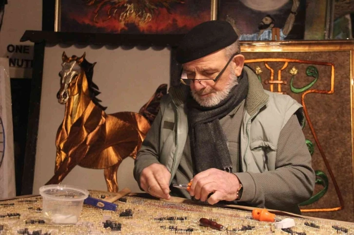 Unutulmaya yüz tutmuş filografi sanatıyla ilgilenen Mustafa Tekoğul, çivi ve tellerin eşsiz uyumunu kullanarak tahtaları sanat eserine dönüştürüyor.