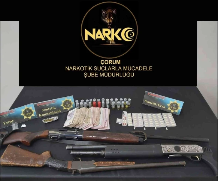 Çorum Emniyet Müdürlüğü, Narkotik Suçlarla Mücadele Şube Müdürlüğü ekipleri tarafından sokak satıcılarına yönelik düzenlenen operasyonda 3 adet av tüfeği ile çok sayıda uyuşturucu madde ele geçirildi.