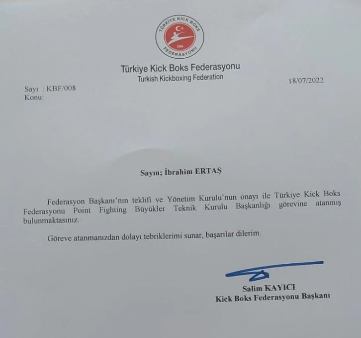 “ Federasyon Başkanımız Salim Kayıcı’nın teklifi, yönetim kurulumuzun onayı ile Kick Boks Büyükler Point Fighting Teknik Kurul Başkanlığına getirildim. Bu onurlu göreve getirilmemi sağlayan Başkanımıza, yönetim kurulu üyelerimize ve Genel Sekreterimiz Harun Demir’e çok teşekkür ediyorum. Bana inananların güvenini boşa çıkarmayacağım.”