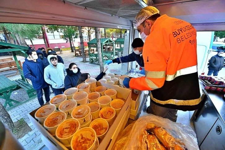 İzmir Büyükşehir Belediye Başkanı Tunç Soyer’in eğitimde fırsat eşitliği ilkesi doğrultusunda üniversite öğrencilerine verilen destek artarak sürüyor. Ege Üniversitesi, Dokuz Eylül Üniversitesi ve İzmir Yüksek Teknoloji Enstitüsünün ardından artık Kâtip Çelebi Üniversitesi öğrencileri de İzmir Büyükşehir Belediyesinin dağıttığı sıcak yemeklere ulaşabiliyor. Aşevleri Şube Müdürlüğü, Kâtip Çelebi Üniversitesi Çiğli Kampüsü içindeki kütüphanenin önünde hafta içi her gün 17.00 ile 19.00 saatleri arasında yemek dağıtmaya başladı. Öğrenciler ise uygulamadan memnun. Dört noktada 3 bin kişilik yemek