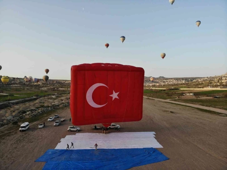 Kapadokya’da üretilen dünyanın en büyük Bayrak Balonu Kapadokya’da havalandı. Yaklaşık iki ay gibi bir sürede üretilen ve üzerinde Türk Bayrağı figürü bulunan Bayrak Balon, dünyanın en büyük Bayrak Balonu unvanını da almış oldu.
