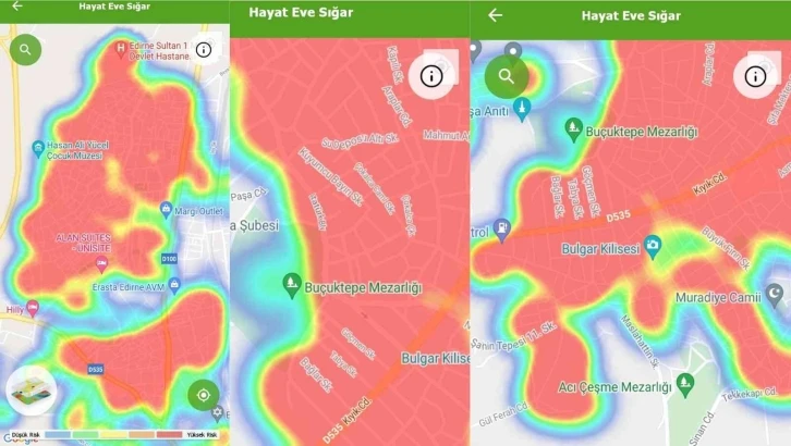 Sağlık Bakanlığı’nın HES uygulamasının haritasına bakıldığında ise neredeyse düşük riski ifade eden yeşil bölge kalmadı. Şehirdeki korona virüs riski düşük olan tek alanın mezarlıklar olması dikkat çekti. Edirne’de gezmek isteyenlerin gidebileceği düşük riskli tek yer mezarlıklar. Aşılama oranı Türkiye’nin üzerinde