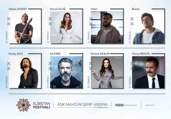 Büyük halk ozanı Aşık Mahzuni Şerif anısına düzenlenen Elbistan Festivali’ne katılacak sanatçıları açıklayan Elbistan Belediye Başkanı Mehmet Gürbüz,“Şehrimizin tanıtılması, şehrimizin üretim değerinin kalitesinin bütün dünyayla paylaşılması adına düzenlediğimiz Elbistan Festivallerinin üçüncüsünü 25 Temmuz’da hayata geçirmeyi planlıyoruz. Bu seneki festivalimizi Aşık Mahzuni Şerif anısına düzenleyeceğiz ve ustaya saygı diyoruz. Mahzuni Şerif’in memleketinde vefatından yaklaşık 20 yıl sonra onun anısına devasa büyük bir festivali hayata geçirmiş olmak bizim için de ayrıca mutluluk verici.Etkinlik takvimimiz netleşti. Sosyal kültürel sportif birçok alanda çok renkli etkinliklere ev sahipliği yapacağız. Birçok sanatçıyı Elbistan’da ağırlayacağız. İnşallah 25 Temmuz’da Haluk Levent ile açılış yapıyoruz. 26 Temmuz’da Velet ve Derya Uluğ’u ile hem rap hem de pop müzik alanında misafir edeceğiz. 27 Temmuz’da Buray’ı, 28 Temmuz’da Koray Avcı’yı, 29 Temmuz’da Ali Kınık’ı, 30 Temmuz’da Demet Akalın’ı ve 31 Temmuz’da Yavuz Bingöl’ü Elbistan’da ağırlamayı planlıyoruz. 24 Temmuz’da da inşallah Mustafa Ceceli konseri olacak. Mustafa Ceceli’nin de görüşmelerini yürütüyoruz” ifadelerini kullandı.