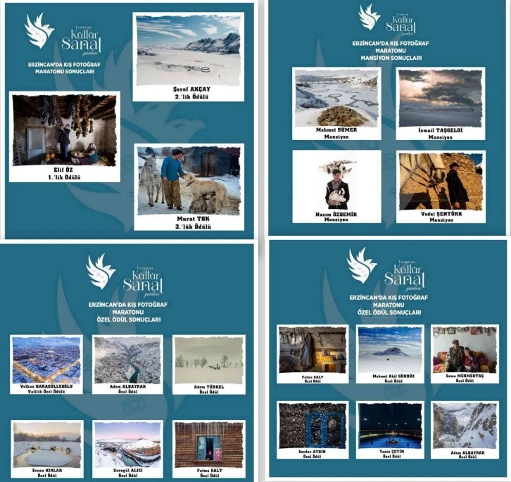 Erzincan sınırları içindeki doğal, tarihi, turistik alanları ve kültürel yaşamı ön plana çıkararak kentin tanıtılmasına katkı sağlamak, insanların fotoğraf sanatına ilgi duymasını ve organizasyon boyunca üretilecek fotoğraflar ile şehrin görsel belleğini zenginleştirerek, günümüzü yarına taşımak amacıyla düzenlenen “Erzincan’da Kış Fotoğraf Maratonu" sonuçları açıklandı.