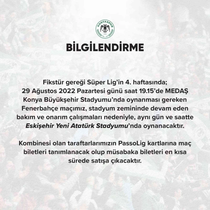 Yeşil-beyazlı kulüp, MEDAŞ Konya Büyükşehir Belediyesi Stadyumu zemininde sorun olduğunu belirterek 29 Ağustos Pazartesi günkü Fenerbahçe maçının İstanbul’da oynanmasını talep etmişti. A.Konyaspor tarafından açıklamaya göre, Süper Lig maçı Eskişehir’de oynanacak. Stadyumdaki bakım ve onarım çalışmalarının devam ettiği belirtilirken, “Fikstür gereği 29 Ağustos Pazartesi günü saat 19.15’de MEDAŞ Konya Büyükşehir Stadyumu’nda oynanması gereken Fenerbahçe maçının, aynı gün ve saatte Eskişehir Yeni Atatürk Stadyumu’nda oynanacaktır” ifadesi kullanıldı.