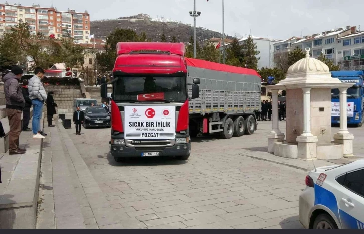 Yozgat Valiliği koordinesinde İl Müftülüğünce düzenlenen "Soğuk Üşütür, İyilik Isıtır" kampanyası kapsamında toplanan 4 tır yardım malzemesi Suriye’nin İdlib şehrine dualarla uğurlandı.