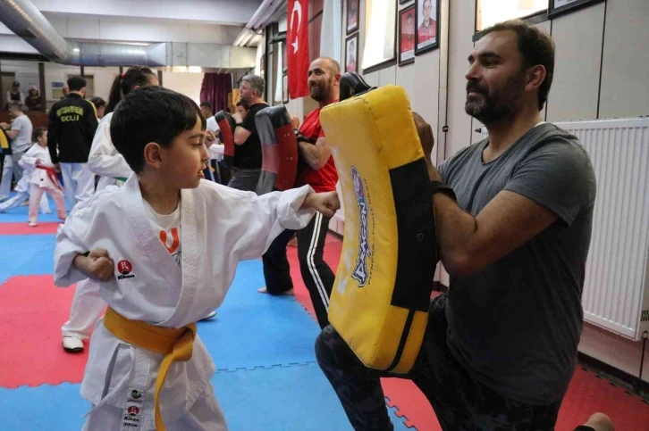 Bolu’da ilk kez mindere inen babalarına karate çalıştıran çocuklar, yaklaşık 1 saat süren antrenmanda babalarını terletti.