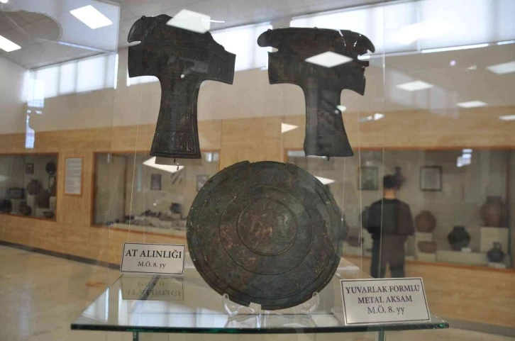 Çetin, “Müzemizin 2015 yılında Ağrı ilinde yakalanan 88 tane Urartu eseri getirilmiş olup, bunların üzerinden çivi yazılarından bunlar Kral Argişli dönemine ait olarak tarihlendirilmektedir. Milattan önce 8’inci yüzyıla tarihlendirilmemdedir. Bunlardan 10 tanesini ilk defa depomuzdan çıkardık ve restorasyon işlevleri, konservasyon işlevleri tamamlandıktan sonra sergi şu gördüğünüz şekilde bir sergi çalışmaları geliştirdik. Tabi bu sergi çalışmamız yıl boyu devam edecek. Bizim ‘1 yıl 6 sergi’ konsepti adı altında 2 aylık dönemler halinde müzemizin deposunda bulunan farklı eserleri, farklı guruptan eserleri bu şekilde sergileyip ziyaretçilerimizin bunları görmesini sağlamayı planlıyoruz. Bu eserlerimizden de ilk gurup olan Urartu eserlerimizden gümüş kaburga gövdeli kablar, yine arkamda gördüğünüz gibi çok önemli bir eser olan Gümüş ve Altın işlemeli bir sitular, situlalar dinsel törenlerde kullanılan kablardır. Urartular döneminde törenlerinde kullanılmaktadır. Yine Pektoral dediğimiz göğüslük özellikle Pektoral ve At alınlığı hemen önündeki yuvarlak metal aksam, bunlar at savaş atlarına Urartuların yerleştirmiş oldukları metal eserlerdir. Bunun dışında tabi bu sergimizin amacı şehrimize gelen özellikle bu dönemde şehrimizin yoğun ziyaretçi sayısının olduğu bu dönemlerde gelen ziyaretçilerimizin depolarımızda da ne tür eserlerimizin olduğunu, sadece daimi olan sergiler dışında geçici olarak sergilediğimiz eserlerinde bu bölgenin ne kadar zengin bir kültürel varlığa sahip olduğunu göstermektir” dedi.