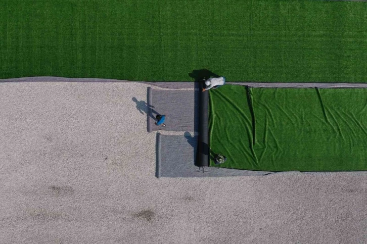 Antalya’nın Kaş ilçesinde yoğun kullanım nedeniyle zaman içerisinde deforme olan halı saha zeminleri yenileniyor.