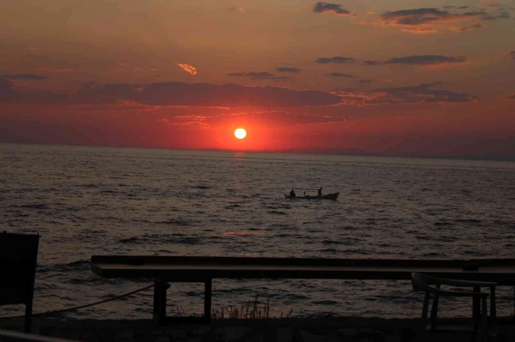 Aydın’ın Kuşadası ilçesinde güneşin batışı sırasında ortaya çıkan doğal güzelliği izlemek ve fotoğraflamak isteyenler, deniz kıyısına gelerek eşsiz manzaranın keyfini çıkardı. Mavi bayrakları denizlerinin yanı sıra doğal güzellikleriyle de her yıl binlerce yerli yabancı turiste ev sahipliği yapan Kuşadası, gün batımında ortaya çıkan manzarasıyla da misafirlerini mest ediyor. Ufukta yavaşça batan güneş, arkasında bıraktığı bulutları da kırmızıya boyarken, güneşten yansıyan ışıklar da sahilde görsel bir şölen oluşturdu. Gün batımında ortaya çıkan manzara vatandaşların ilgi odağı olurken, birçok kişi görsel şöleni fotoğraflamak için adeta birbiriyle yarıştı. Akşam saatlerinde ise sahile gelen yerli ve yabancı turistler gün batımının eşsiz güzelliğini izlemeye doyamıyor. Kimi vatandaşlar sandalyelerine oturup manzarayı izlerken, kimi vatandaşlar ise yüzmeyi tercih ediyor. Yaklaşık bir saat öncesinden başlayan keyifli manzara, güneşin engin sularda kayboluşu ile sona eriyor.