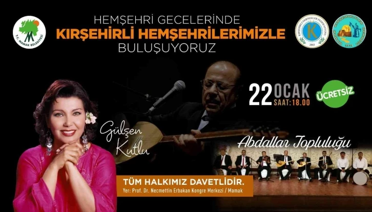 Prof. Dr. Necmettin Erbakan Kongre Merkezi’nde 22 Ocak tarihinde Saat: 18.00’da gerçekleşecek olan ‘Hemşehri Geceleri’nde sahne alacak Türk halk müziği sanatçısı Gülşen Kutlu ve Abdallar Topluluğu, şehrin manevi ve kültürel değerlerini yansıtan ezgileriyle dinleyicilere müzik ziyafeti yaşatacak. Tamamen ücretsiz olan kültür cümbüşü konser Mamak Belediyesinin sosyal medya hesaplarından da canlı olarak verilecek. Hemşeri Geceleri’nde buluşalım