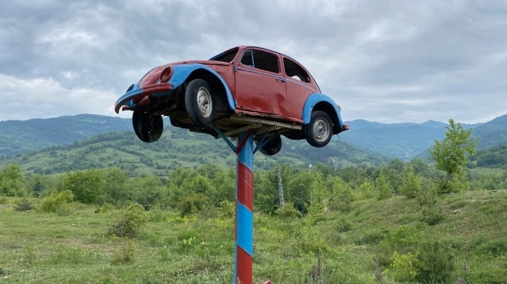 17 sene önce belde olan Ovacuma’nın tanıtılması amacıyla direk üzerine dikilen otomobil, her yıl Süper Lig şampiyonu olan takımların renklerine bürünüyor.