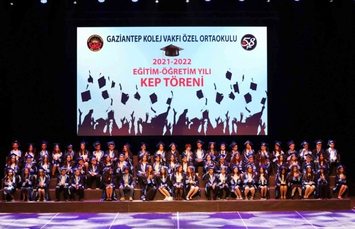 2021-2022 eğitim öğretim yılının sona ermesiyle birlikte Gaziantep Kolej Vakfı Özel Okulları bünyesinde faaliyet gösteren kurumlarda kep töreni heyecanı yaşanıyor. GKV Özel ilkokulunun ardından bu kez de Gaziantep Kolej Vakfı Özel Ortaokulu’ndan bu yıl mezun olan öğrenciler için coşkulu bir kep töreni düzenlendi. Gaziantep Kolej Vakfı Mütevelli-Yönetim Kurulu Başkanı Seyhan Fesli, GKV Mütevelli ve Yönetim Kurulu Üyesi Osman Kıratlı, GKV Özel Okulları Genel Müdürü İsmet TİRYAKİ, GKV Özel Ortaokulu Müdürü Seçil Güldemet, idareci, öğretmenler ve velilerin yanı sıra çok sayıda davetlinin katılımıyla gerçekleştirilen kep törende coşku dolu anlar yaşandı.