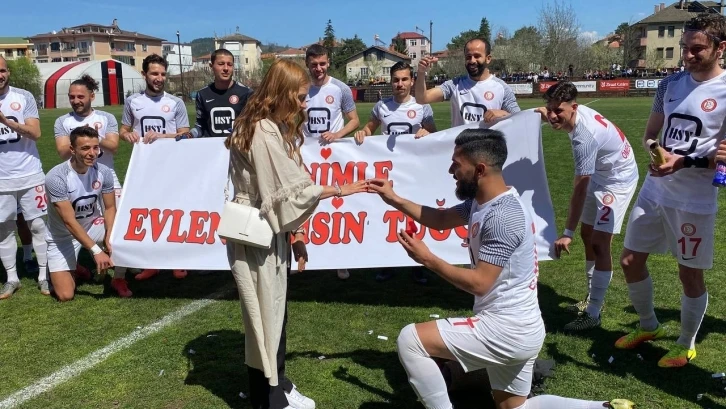 Bartın’da Bölgesel Amatör Lig (BAL) şampiyonluğunu kutlayan Bartınspor’un başarılı futbolcularından Hasan Cankurt kız arkadaşına stadyumda binlerce taraftar önünde evlilik teklifi etti.