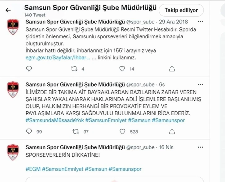 İl Emniyet Müdürlüğü Samsun Spor Güvenliği Şube Müdürlüğü, sosyal medya hesabından yaptığı açıklamada olay hakkında şu ifadelere yer verdi: