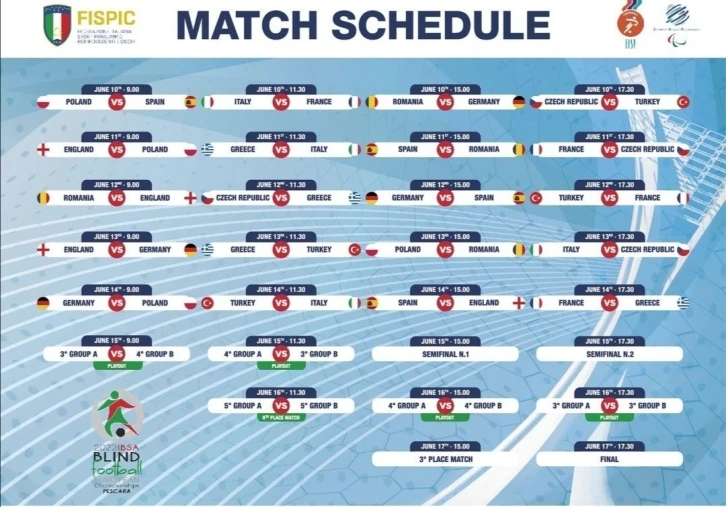 Türkiye Sesi Görenler Milli Takımı’nın, IBSA Avrupa (Görme Engelliler) Futbol Şampiyonası’ndaki rakipleri belli oldu. Sesi Görenler Milli Takımı, A Grubu’nda İtalya, Fransa, Çekya ve Yunanistan ile eşleşti.