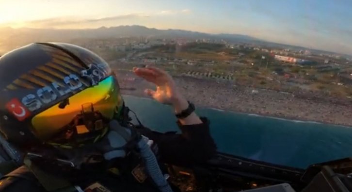 Antalya´da Cumhuriyet Bayramı´nın 98´inci yıl dönümü kutlamaları kapsamında gösteri uçuşu gerçekleştiren Solotürk´ün kabini içerisinden çekilen görüntüler nefes kesti.