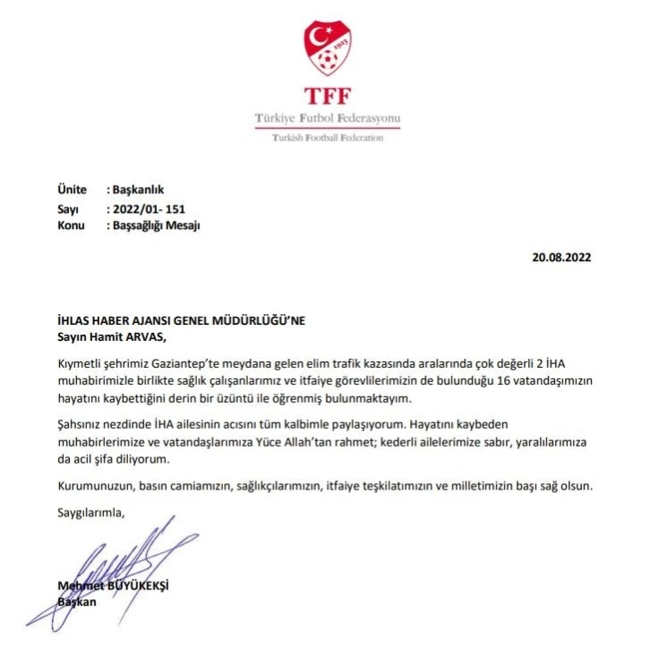 Türkiye Futbol Federasyonu Başkanı Mehmet Büyükekşi, Gaziantep’te yaşanan kazada hayatını kaybeden İhlas Haber Ajansı (İHA) muhabirleri Umut Yakup Tanrıöver ile Muhammed Abdulkadir Esen için taziye mesajı gönderdi.