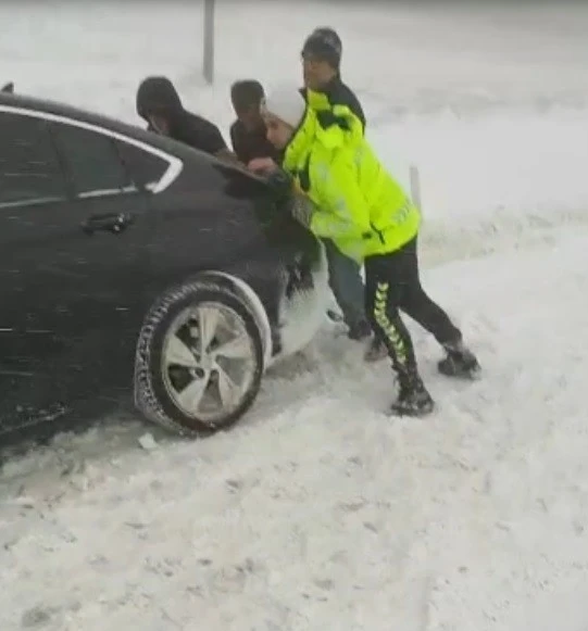Tokat’ın Niksar ilçesinde buzlanma ve tipiden dolayı Yolda kalan araçlara trafik polisleri yardım etti.