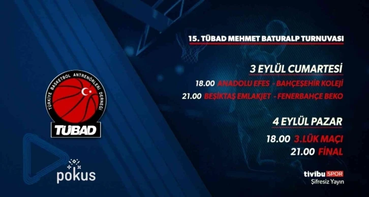 Tivibu Spor, Türkiye Basketbol Antrenörleri Derneği’nin (TÜBAD) düzenlediği Mehmet Baturalp Turnuvası’na ev sahipliği yapıyor. Bu yıl 15.’si yapılan turnuva, 3-4 Eylül tarihlerinde A. Efes, Bahçeşehir Koleji, Beşiktaş Emlakjet ve Fenerbahçe Beko arasında yaşanıyor. Türk Telekom’un dijital TV platformu Tivibu, sporseverlere özel içerikler sunmaya devam ediyor. Türk basketbolunun devleri, Türk Telekom’un e-cüzdan uygulaması Pokus’un katkılarıyla düzenlenecek 15. TÜBAD Mehmet Baturalp Turnuvası’nda karşılaşıyor. Sinan Erdem Spor Salonu’nda oynanan turnuva Tivibu Spor’dan naklen yayınlanacak. 14. TÜBAD Mehmet Baturalp turnuvası final müsabakasında zorlu rakibi Darüşşafaka Tekfen’i 22 sayı farkla yenerek kupayı evine götüren Fenerbahçe Beko, bu yıl Anadolu Efes, Bahçeşehir Koleji ve Beşiktaş Emlakjet’e karşı mücadele ediyor. 3 Eylül Cumartesi günü saat 18.00’da A. Efes- Bahçeşehir Koleji, 21.00’da ise Beşiktaş Emlakjet - Fenerbahçe Beko maçlarının yaşanacağı turnuvanın üçüncülük ve final mücadeleleri 4 Eylül Pazar akşamı saat 18.00 ve 21.00’da oynanacak.