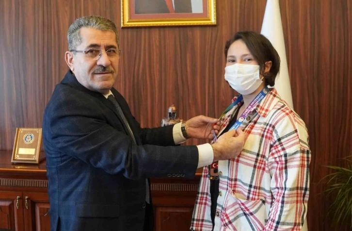 Türkiye Üniversiteler Arası Bilek Güreşi Şampiyonası’nda 70 kilo sol kolda 3’üncülük başarısı elde Yalova Üniversitesi öğrencisi Elif Hatice Alptekin, Rektör Prof. Dr. Suat Cebeci’yi ziyaret etti.