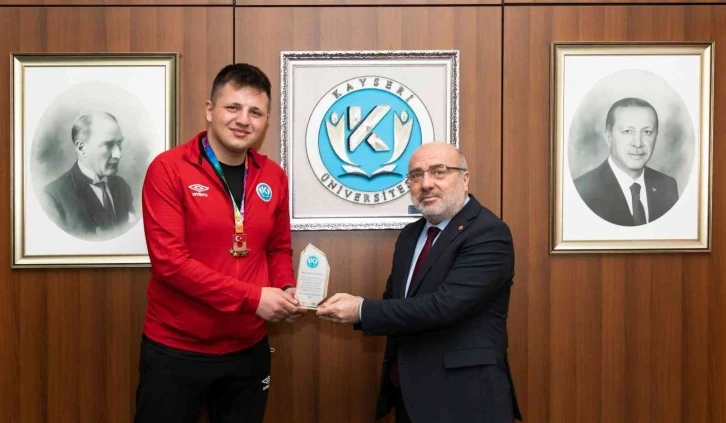 KAYÜ Rektörü Prof. Dr. Kurtuluş Karamustafa, başarılı sporcu Yılmaz Kılnamaz’ı şampiyonadaki başarısından dolayı kutladı ve kendisine plaket takdim etti.,