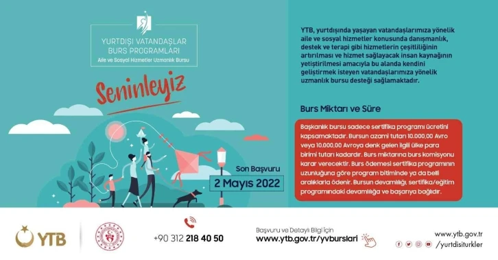 YTB tarafından hem yurt dışında yaşayan vatandaşlara yönelik aile ve sosyal hizmetler konusunda; danışmanlık, destek ve terapi gibi hizmetlerin artması hem de hizmet sağlayacak insan kaynağının yetiştirilmesi için hayata geçirilen “YTB Aile ve Sosyal Hizmetler Alanlarında Uzmanlık Bursu” programının başvuruları devam ediyor. Programa yurt dışında ikamet eden ve bu ülkelerde bulunan aile ve sosyal hizmetlere uygun bölümlerde (pedagoji, sosyal pedagoji, pedagojik psikoloji, psikoloji, klinik psikoloji, tıp vb.) üniversite eğitimi almış kişiler başvurabilecek. Programla birlikte terapi ya da danışmanlık gibi özel alanlarda adayların uzmanlaşmalarını sağlayacak mesleki sertifika programlarının desteklenmesi amaçlanıyor. Hizmet yeri ve süresi bursiyer ile YTB tarafından planlanacak
