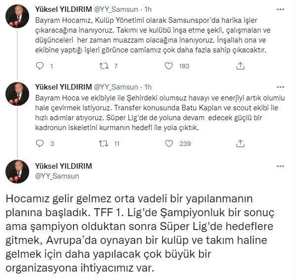 Kulüp Yönetimi olarak Bayram hocanın Samsunspor’da harika işler çıkaracağına inandıklarını dile getiren Yıldırım, “Bayram Hoca ve ekibiyle ile şehirdeki olumsuz havayı ve enerjiyi artık olumlu hale çevirmek istiyoruz. Transfer konusunda Batu Kaplan ve scout ekibi ile hızlı adımlar atıyoruz. Süper Lig’de de yoluna devam edecek güçlü bir kadronun iskeletini kurmanın hedefi ile yola çıktık. Hocamız gelir gelmez orta vadeli bir yapılanmanın planına başladık. TFF 1. Lig’de Şampiyonluk bir sonuç ama şampiyon olduktan sonra Süper Lig’de hedeflere gitmek, Avrupa’da oynayan bir kulüp ve takım haline gelmek için daha yapılacak çok büyük bir organizasyona ihtiyacımız var” şeklinde konuştu.