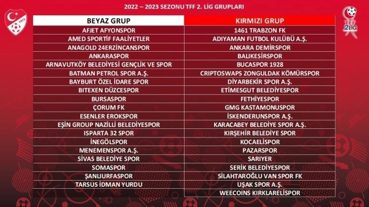 TFF Hasan Doğan Milli Takımlar Kamp ve Eğitim Tesisleri’nde gerçekleştirilen kura çekiminde 24 Erzincanspor, yeni sezonda beyaz grupta mücadele edecek. 2022-2023 sezonunda TFF 2. Lig Beyaz Grup’ta 19 takım yer alırken, müsabakalar 27-28 Ağustos 2022 tarihlerinde oynanacak. Normal sezon 29 Nisan 2023’te sona erecek.
