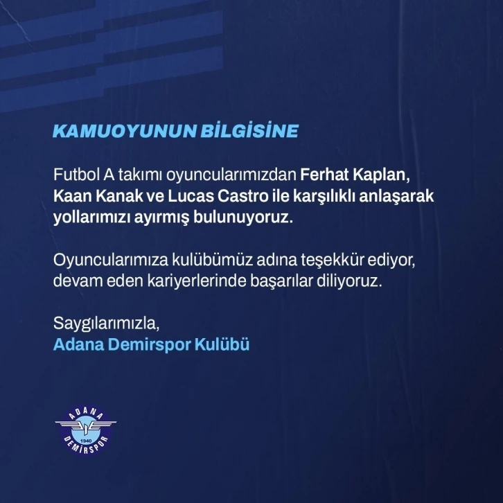 Spor Toto Süper Lig ekiplerinden Adana Demirspor’da Ferhat Kaplan, Kaan Kanak ve Lucas Castro ile yollar ayrıldı. Ayrılık, kulüp başkanı Murat Sancak’ın, "Ruhunu ortaya koymayanlarla devam edilmeyecek, amacı sadece para olanla da yürümeyeceğiz" açıklamasından sonra gerçekleşti.