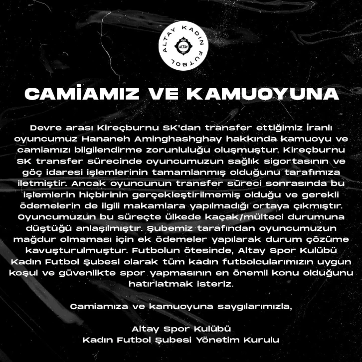 “Devre arası Kireçburnu SK’dan transfer ettiğimiz İranlı oyuncumuz Hananeh Aminghashghay hakkında kamuoyu ve camiamızı bilgilendirme zorunluluğu oluşmuştur. Kireçburnu SK transfer sürecinde oyuncumuzun sağlık sigortasının ve göç idaresi işlemlerinin tamamlanmış olduğunu tarafımıza iletmiştir. Ancak oyuncunun transfer süreci sonrasında bu işlemlerin hiçbirinin gerçekleştirilmemiş olduğu ve gerekli ödemelerin de ilgili makamlara yapılmadığı ortaya çıkmıştır. Oyuncumuzun bu süreçte ülkede kaçak/mülteci durumuna düştüğü anlaşılmıştır. Şubemiz tarafından oyuncumuzun mağdur olmaması için ek ödemeler yapılarak durum çözüme kavuşturulmuştur. Futbolun ötesinde, Altay Spor Kulübü Kadın Futbol Şubesi olarak tüm kadın futbolcularımızın uygun koşul ve güvenlikte spor yapmasının en önemli konu olduğunu hatırlatmak isteriz.”