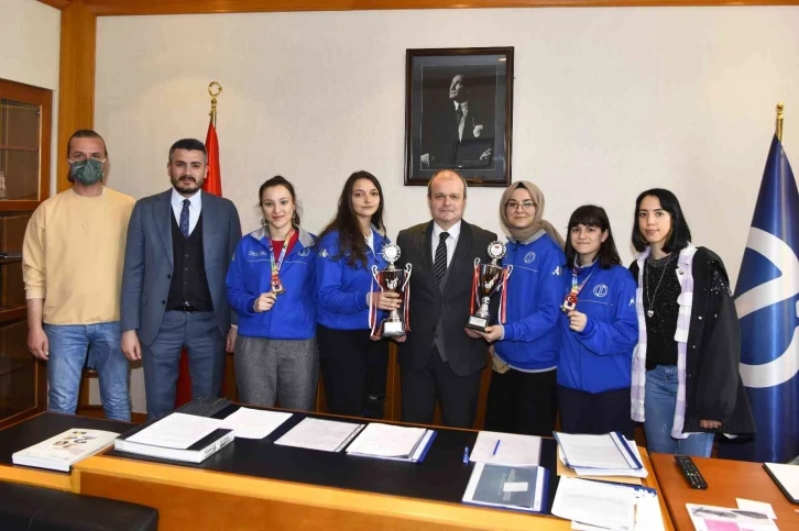 Sporcular, kazandıkları türkiye üçüncülüğü kupalarını, sks daire başkanı galip özsarı eşliğinde anadolu üniversitesi rektör yardımcısı prof. Dr. Fatih temizel'e takdim etti.