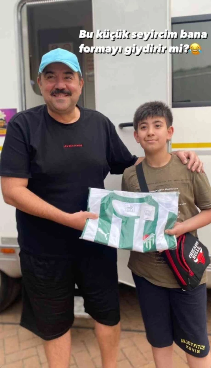 Minik bir Bursaspor taraftarı Bursa Bülbül’ü filmi setine gelerek ünlü komedyen Ata Demier’e yeşil-beyazlı forma hediye etti. Demler de minik Timsah’ı kırmayarak formayı sırtına geçirdi.