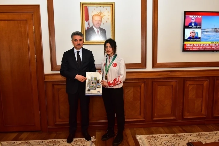 Vali Aydın Baruş, Avrupa Muay Thai Şampiyonası’nda altın madalya kazanan Malatyalı sporcu Eylül Aslan’ı makamında kabul etti.