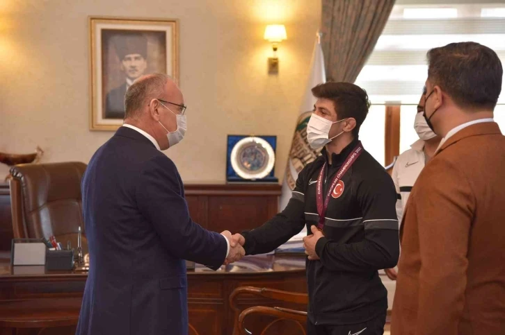 Macaristan'da düzenlenen avrupa güreş şampiyonası'nda grekoromen stil 60 kiloda mücadele ederek altın madalya kazanan milli güreşçi kerem kamal, manisa valisi yaşar karadeniz’i ziyaret etti.