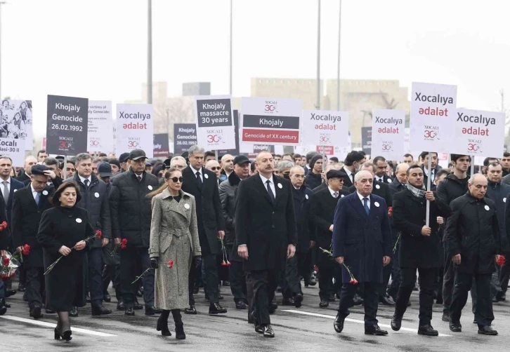 Azerbaycan’ın başkenti Bakü’de Hocalı Katliamı’nın 30. yıldönümünde Azerbaycan Cumhurbaşkanı İlham Aliyev, bakanlar, milletvekilleri ile birlikte çok sayıda bürokrat Hocalı Anıtı’nı ziyaret etti. Gerçekleştirilen yürüyüşe katılan Aliyev, tören alanına gelerek anıta çelenk bıraktı ve saygı duruşunda bulundu. Daha sonra Azerbaycan Başbakanı Ali Asadov, Azerbaycan Milli Meclis Başkanı Sahibe Gafarova, Azerbaycan Cumhurbaşkanı Birinci Yardımcısı Mehriban Aliyeva anıta gül bırakırken hükümet, askeri yöneticiler de törende hazır bulundu. "Türkiye bu davada yine Azerbaycan’ın yanındadır"