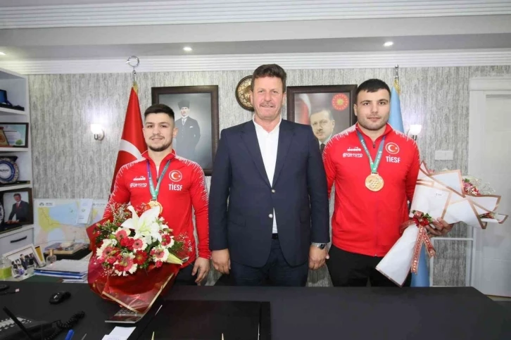 Brezilya’da düzenlenen 24. İşitme Engelliler Yaz Olimpiyatlarında Şampiyon olan Akyazılı Ömer Saner ve Karapürçekli Onur Arı’yı ağırlayan Akyazı Belediye Başkanı Bilal Soykan, “Başarıları ile göğsümüzü kabartan ve bizleri gururlandıran şampiyonlarımızı tebrik ediyorum” dedi.