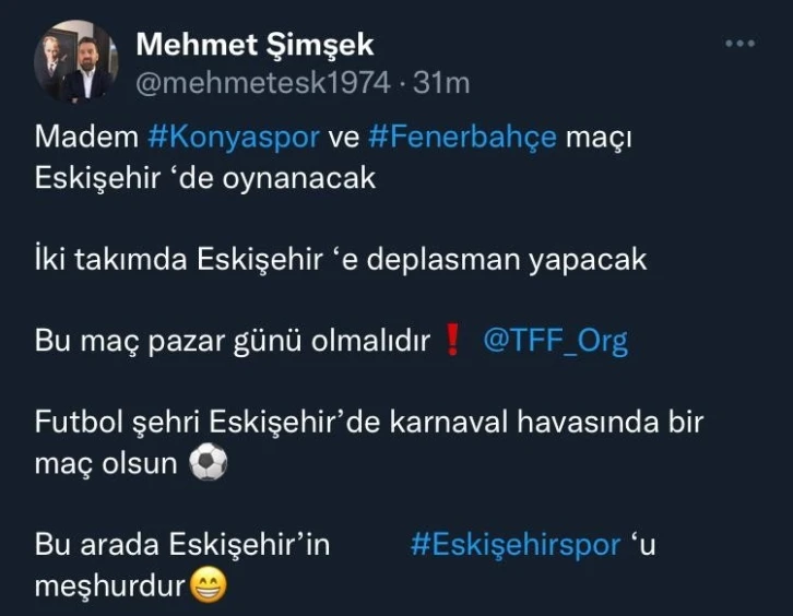 Eskişehirspor Başkanı Mehmet Şimşek, pazartesi günü Fenerbahçe ile Konyaspor arasında oynanacak maç öncesinde, “Madem Konyaspor ve Fenerbahçe maçı Eskişehir’de oynanacak, iki takım da deplasman yapacak. Bu maç pazar günü olmalıdır” diyerek TFF’ye seslendi.