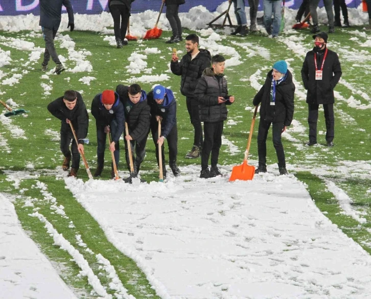 Saha zeminin müsabaka saatine kadar temizlenmesi için çabalayan stadyum görevlileri, yeni bir kar yağışı için de hazırlıklı olarak bekliyor.